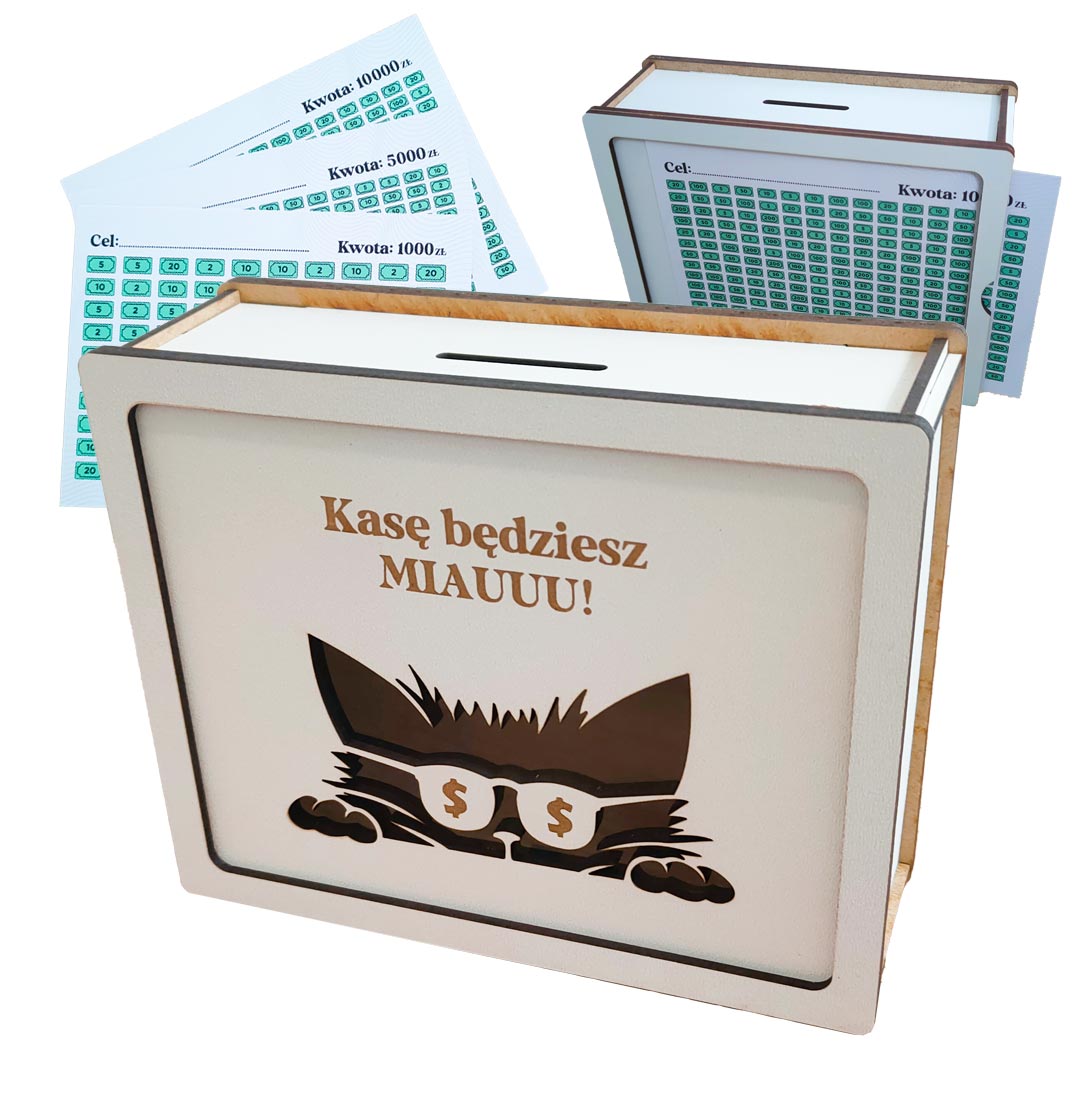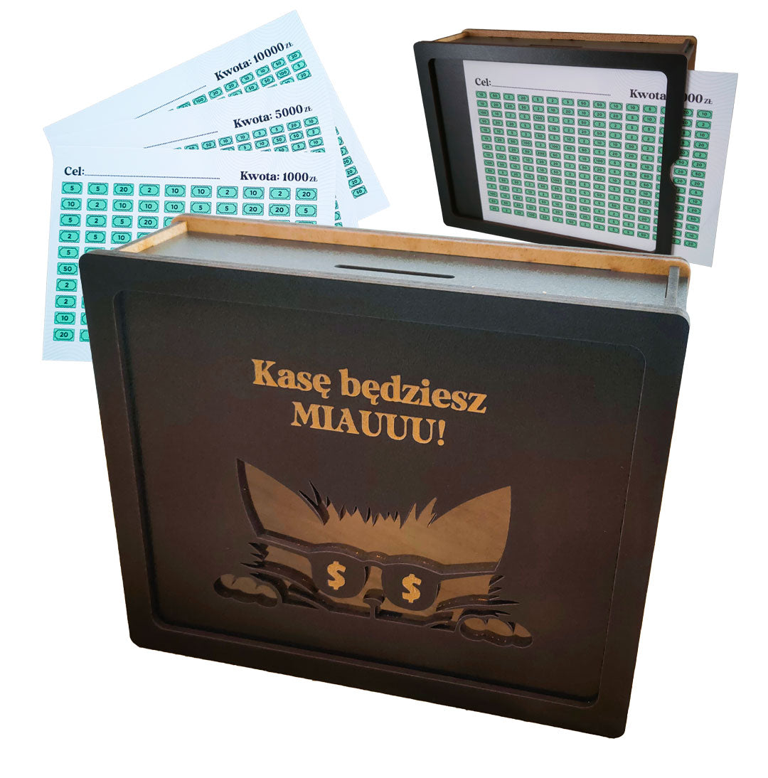 Oszczędzaj pieniądze w wyjątkowy i motywujący sposób! Drewniana skarbonka z frontem z przezroczystym panelem w kształcie kotka w okularach to praktyczny i piękny gadżet finansowy, który pomoże nauczyć dziecko oszczędzania i realizacji celów.