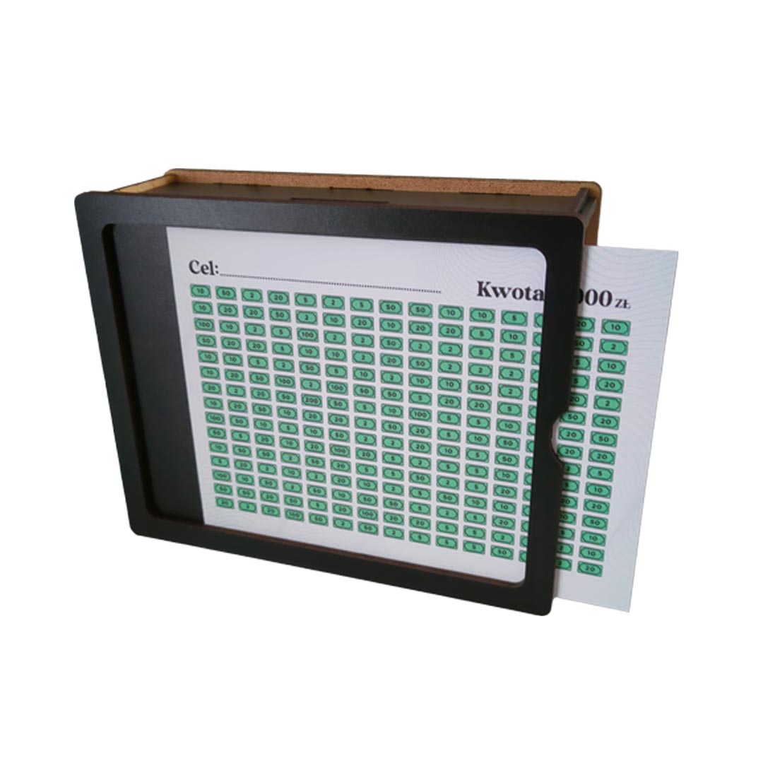 - Personalizacja: na kartkach do wykreślania wpisz swój własny cel oszczędzania (np. ślub, samochód, podróż, wakacje, prezent marzeń)