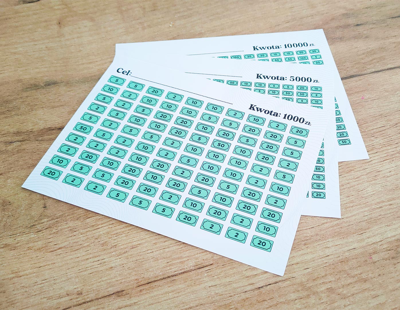 - Personalizacja: na kartkach do wykreślania wpisz swój własny cel oszczędzania (np. wesele, ślub, podróż, wakacje, prezent marzeń)