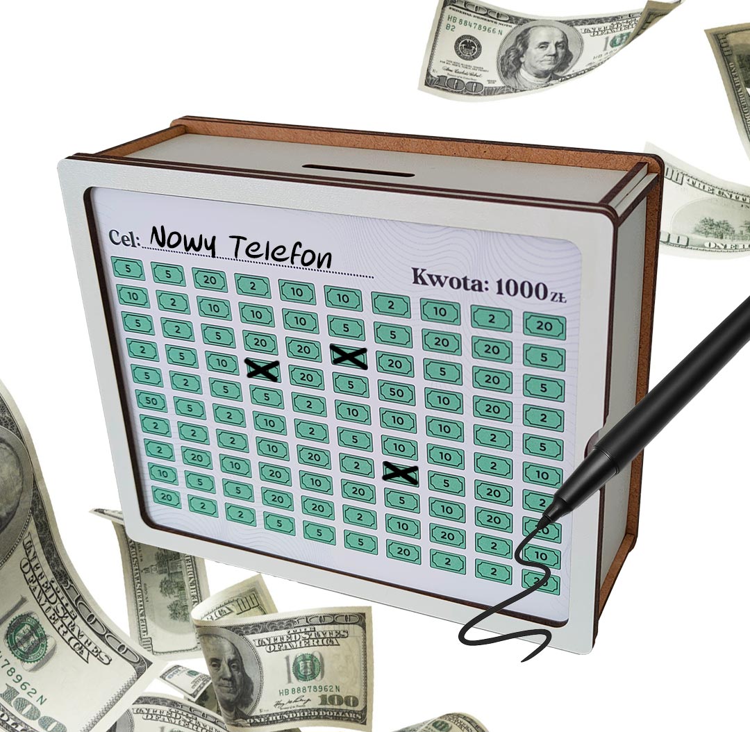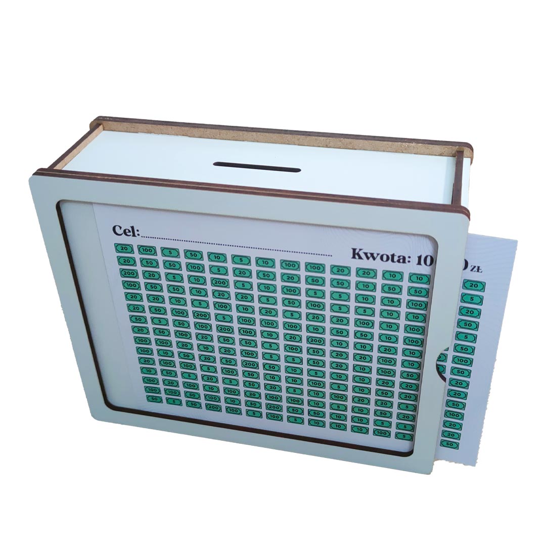 - Personalizacja: na kartkach do wykreślania wpisz swój własny cel oszczędzania (np. ślub, samochód, podróż, wakacje, prezent marzeń)